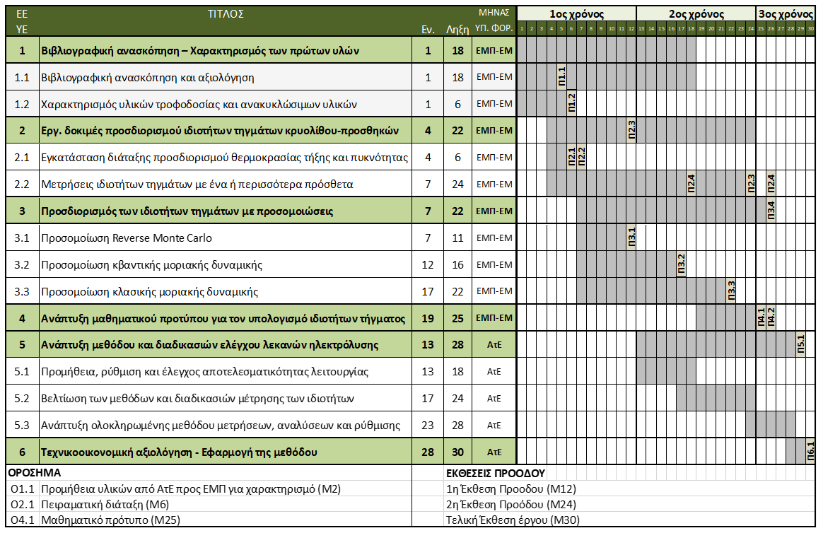 Τα αποτελέσματα που θα προκύψουν από τις ΕΕ 2 και 3 σε συνδυασμό με τα αποτελέσματα της ΕΕ 1, θα χρησιμοποιηθούν στην ΕΕ4 για να αναπτυχθεί ένα νέο μαθηματικό πρότυπο (μοντέλο) το οποίο θα προβλέπει τις ιδιότητες του τήγματος. Το μοντέλο αυτό θα επαληθευθεί αρχικά με χρήση βιομηχανικών δεδομένων ή δοκιμών βιομηχανικής κλίμακας που έχουν γίνει από το ΑτΕ στο παρελθόν. Παράλληλα, στα πλαίσια της ΕΕ5, θα εξετασθεί από το ΑτΕ η δυνατότητα εκτέλεσης περισσότερο αυτοματοποιημένων βιομηχανικών μετρήσεων θερμοκρασίας και δειγματοληψιών από τα λουτρά ηλεκτρόλυσης με νέο εξοπλισμό, η εκτέλεση των εργαστηριακών μετρήσεων με νέες, πιο αυτοματοποιημένες τεχνικές, ο προσδιορισμός των ιδιοτήτων του λουτρού με βάση τα αποτελέσματα της ΕΕ4, η αναθεώρηση των διαδικασιών ρύθμισης των παραμέτρων λειτουργίας των κελιών ηλεκτρόλυσης, που όλα μαζί θα αποτελέσουν μια ολοκληρωμένη βιομηχανική μέθοδο λειτουργίας των κελιών ηλεκτρόλυσης σε συνθήκες καλύτερης θερμικής ρύθμισης και συνεπώς και απόδοσης. Τέλος, στην ΕΕ6 με βάση τα στοιχεία που θα προκύψουν θα γίνει η τελική τεχνικοοικονομική αξιολόγηση της προταθείσας μεθόδου του έργου και θα ληφθεί απόφαση για την τελική βιομηχανική της εφαρμογή. Το χρονοδιάγραμμα υλοποίησης του έργου, με τις ενότητες και υπο-ενότητες εργασίας, τα παραδοτέα και τα ορόσημα, όπου υπάρχουν, δίδεται στο Σχήμα 6.