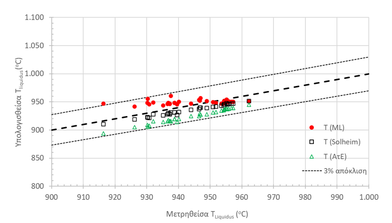 Η σύγκριση των αποτελεσμάτων του προτεινόμενου μοντέλου μηχανικής μάθησης (ML), και των μοντέλων Solheim και εσωτερικο μοντέλο ΑτΕ (άξονας Υ) σε σχέση με την επιτόπου μέτρηση της θερμοκρασίας Liquidus με το όργανο Fiberlab (άξονας Χ) κατά τις βιομηχανικές δοκιμές, δίδεται στο επομενο σχήμα, από όπου φαίνεται η σχετική υπεροχή του μοντέλου ML.